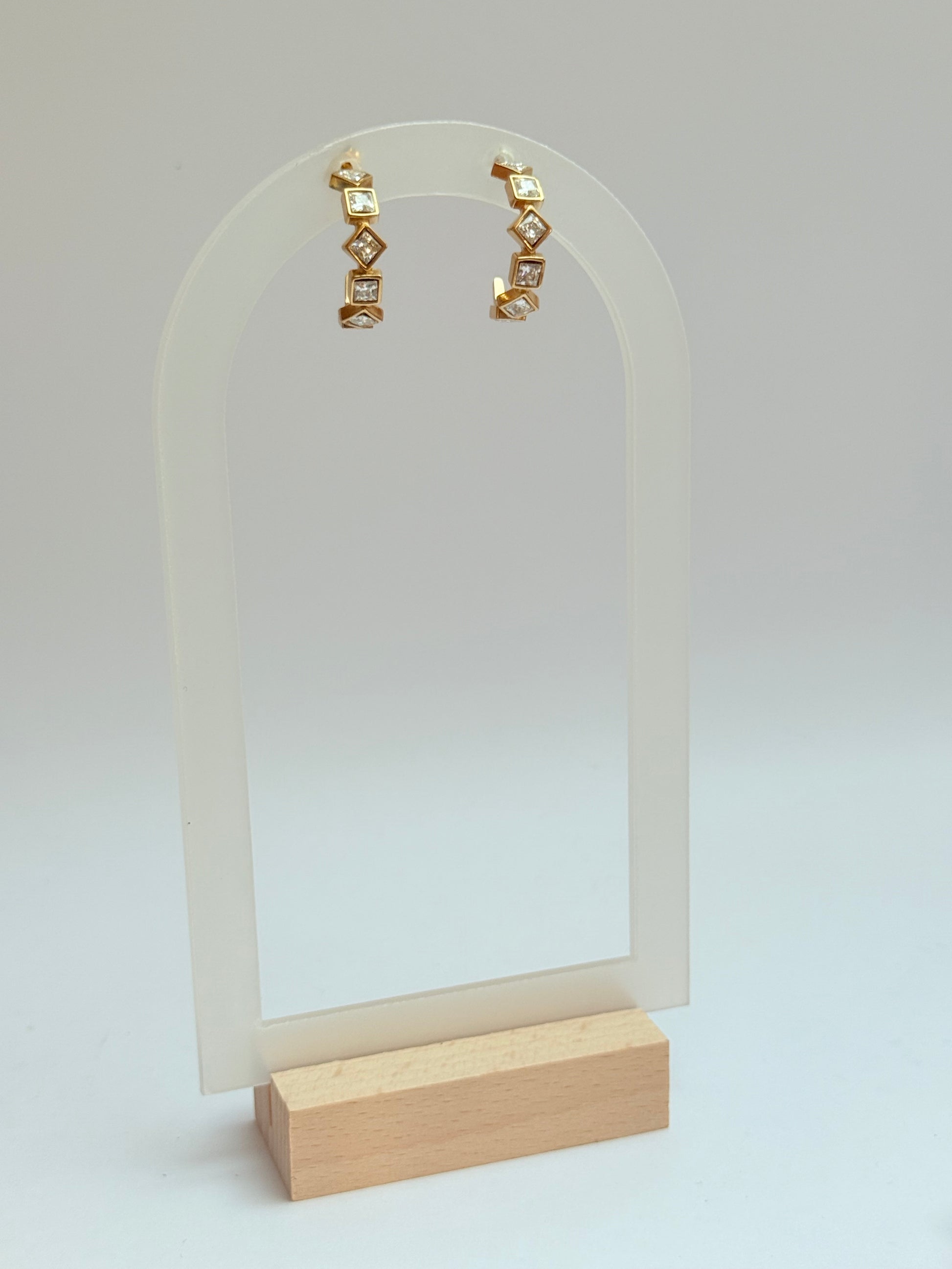 A beautiful gold stud hoop earring made from stainless steel with rhinestone geometric detail.