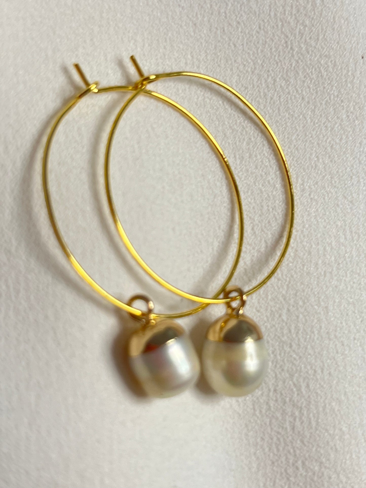 These little beauties are all made with a 24k gold plated light weight hoop measuring 30mm. They have a beautiful Pearl and gold charm on each hoop which are simple and stylish. They are lead and nickel free.