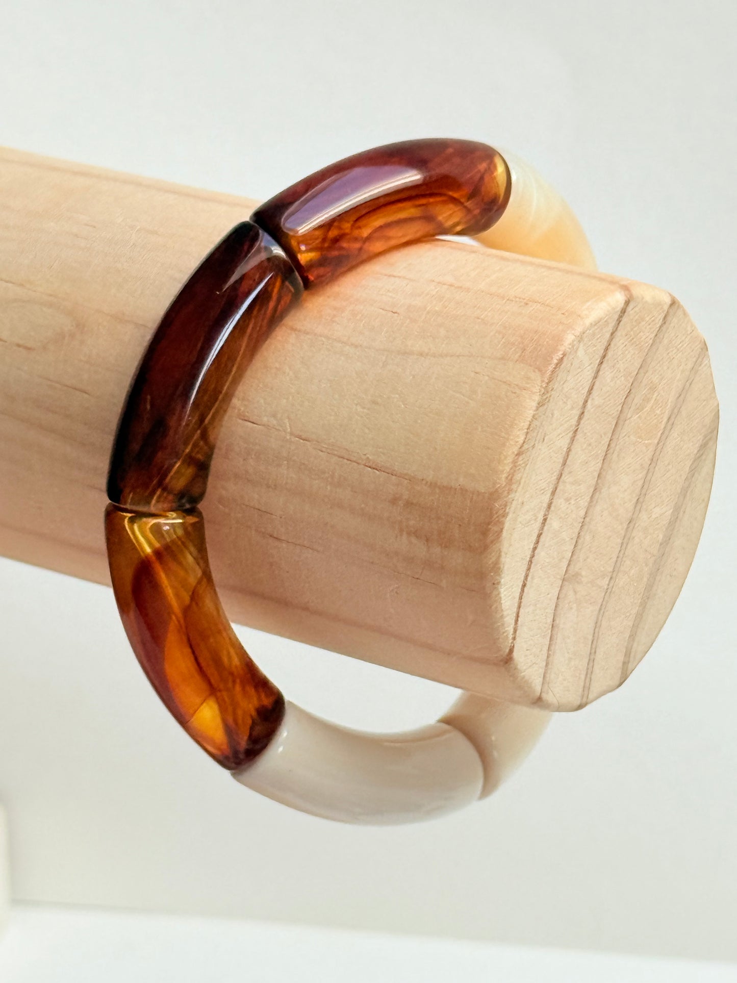 This bangle is made with acrylic tube beads tied together with see through elastic threading. It is a loose fit bracelet with a cloudy beige and tortoise shell colouring.