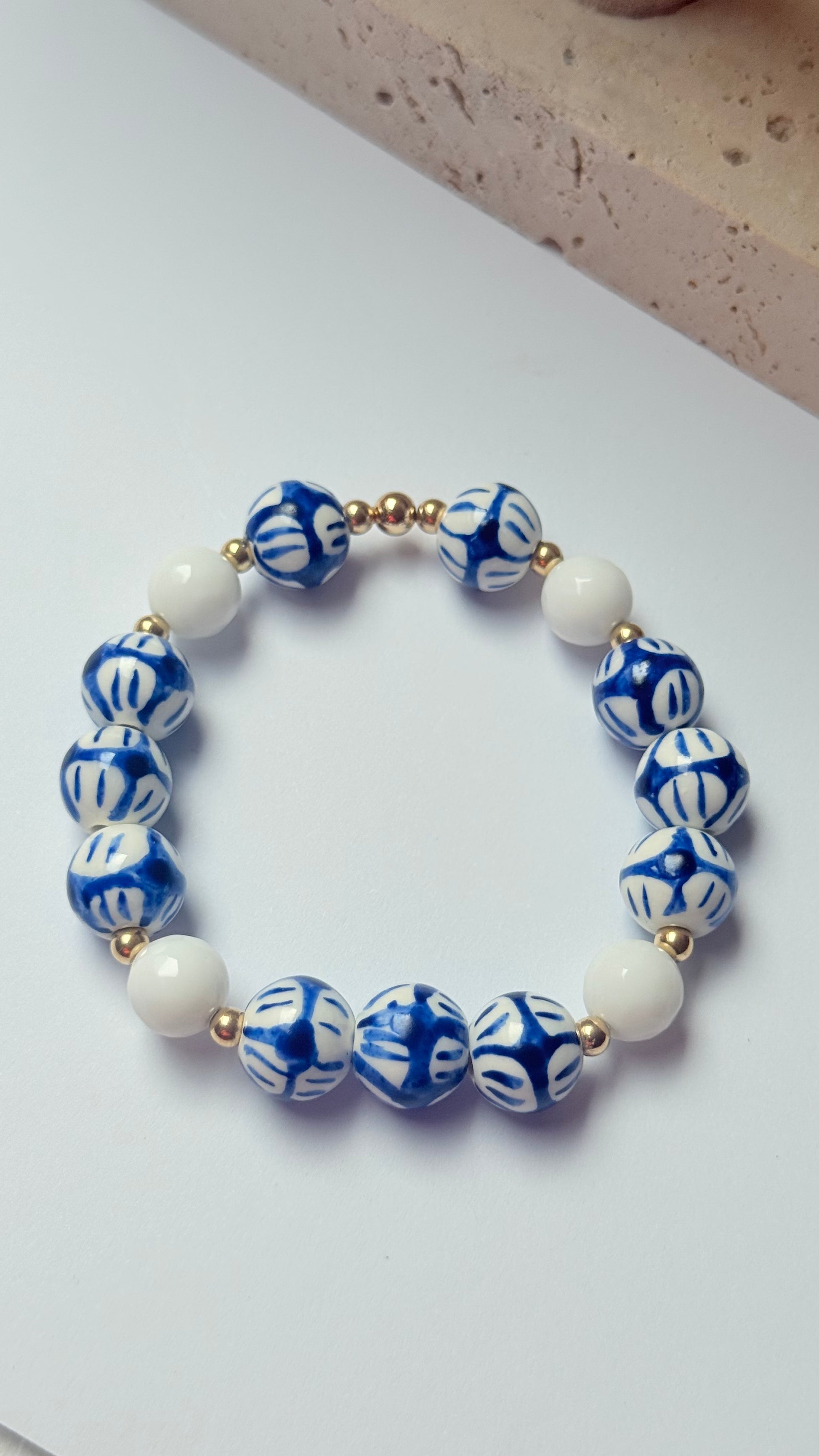 This bracelet is made with 10mm porcelain beads and finished interspersed with a gorgeous dyed white jade bead and finished with gold filled beading. This gorgeous bracelet is the perfect bracelet to create your stack around especially if you love natural stones .